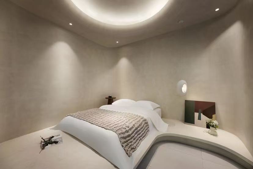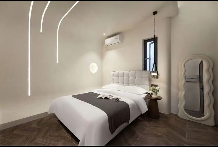 卧室:房间内设有一张柔软舒适的[床型,如大床/双人床],床垫采用高品质材料,能够完美贴合人体曲线,为客人提供深度睡眠体验。床上用品均选用纯棉材质,触感亲肤,洁白的床单、柔软的被子和蓬松的枕头,经过严格清洗和消毒,确保卫生安全。卧室还配备了一盏柔和的床头灯,方便客人在睡前阅读或放松。